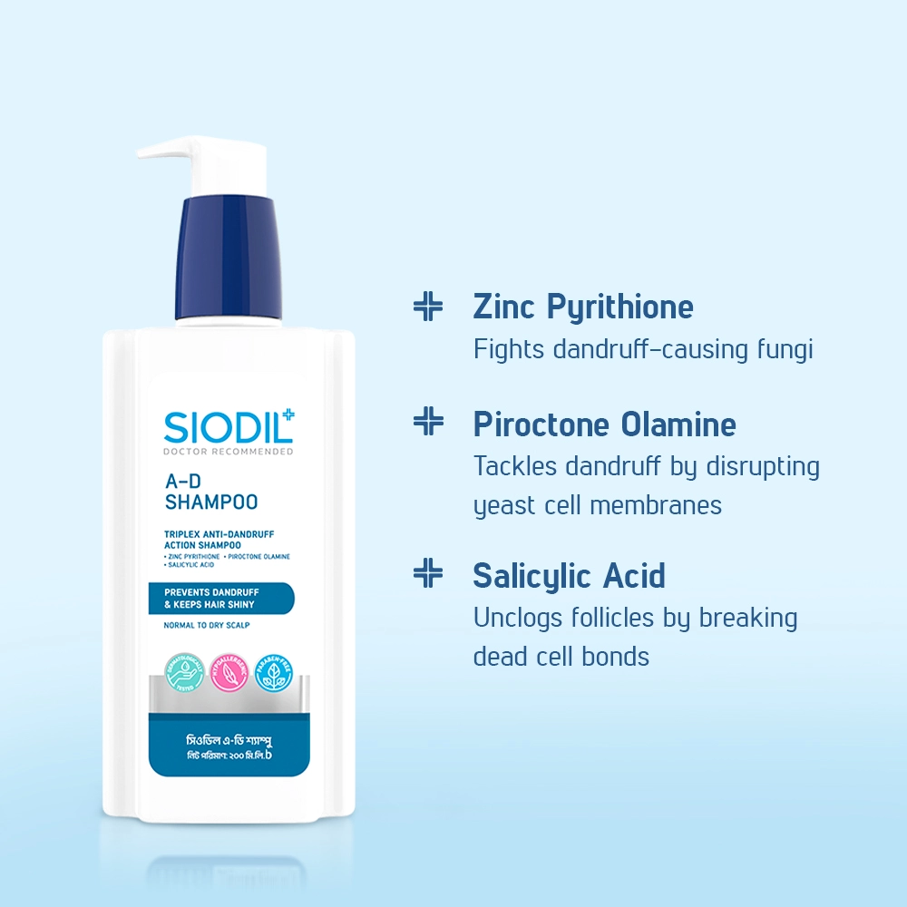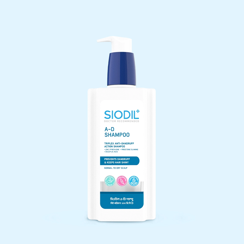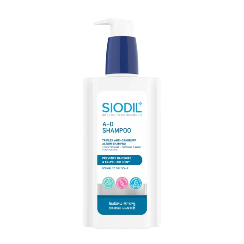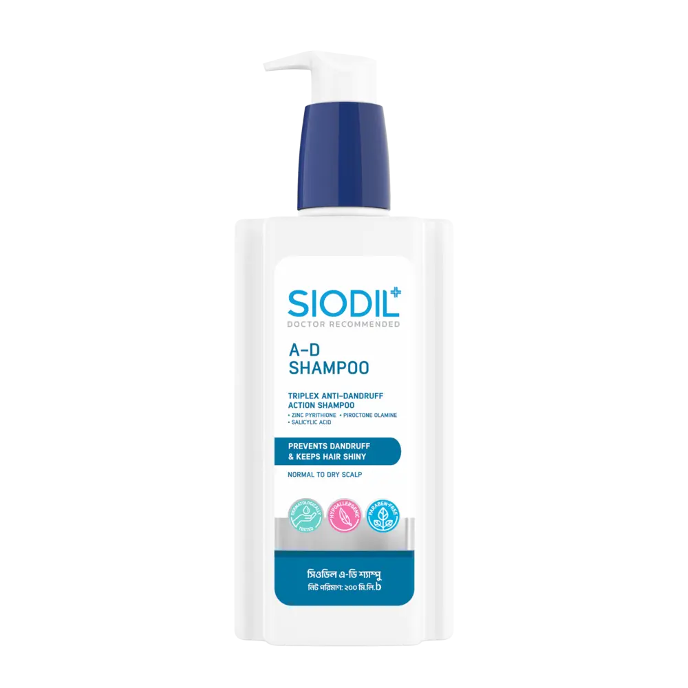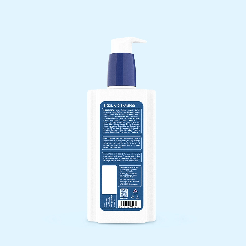 Siodil A-D Shampoo is a specially formulated shampoo designed to effectively combat dandruff and relieve scalp irritation. It contains a powerful combination of active ingredients, including Zinc Pyrithione, Piroctone Olamine, and Salicylic Acid, that work together to provide deep cleansing while nourishing the scalp, preventing the growth of dandruff-causing fungi, and removing dead skin cells.