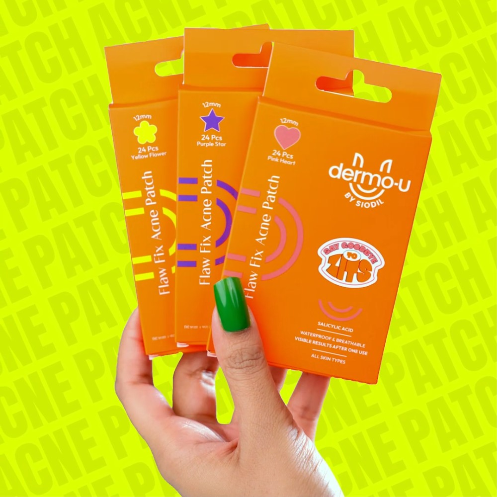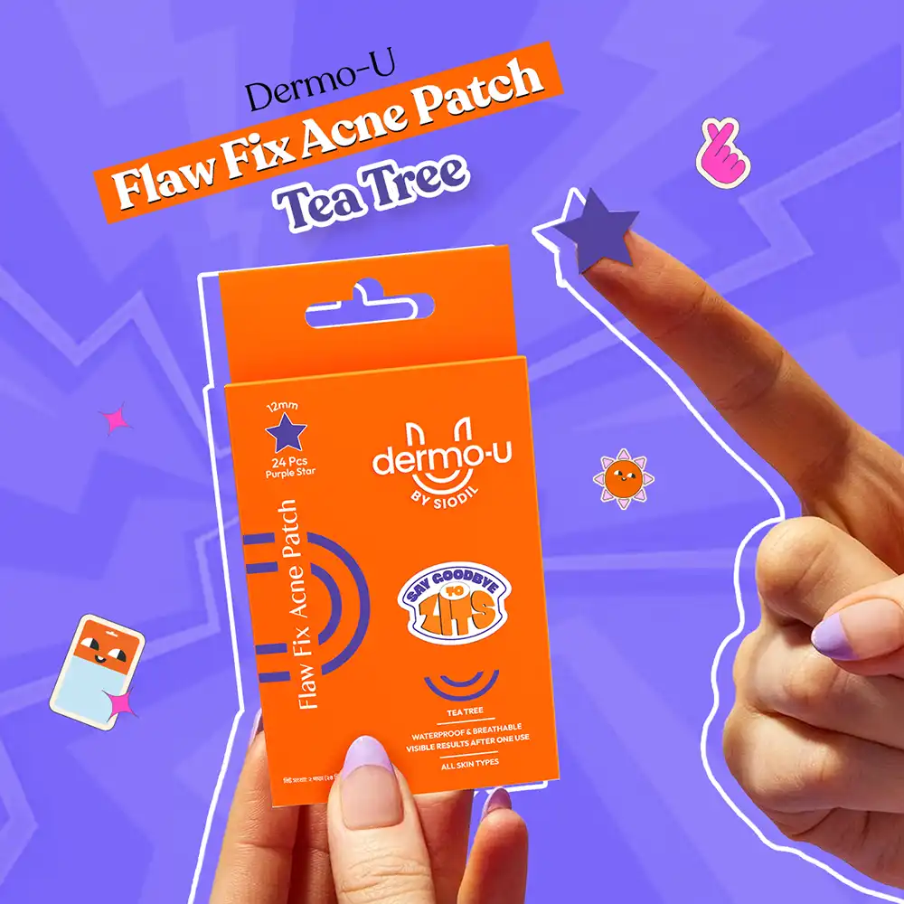 Dermo-U Flaw Fix Acne Patch Tea Tree is crafted from vegan hydrocolloid fiber to absorb pus, flatten pimples, and protect them from external pollutants. Infused with tea tree, known for its antibacterial properties, it calms irritated skin while delivering visible results after just one use. Waterproof, breathable, and gentle for all skin types, it can be worn day and night.