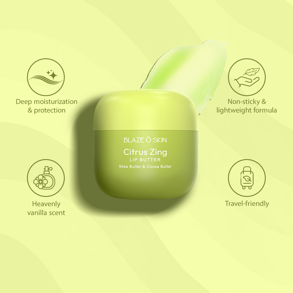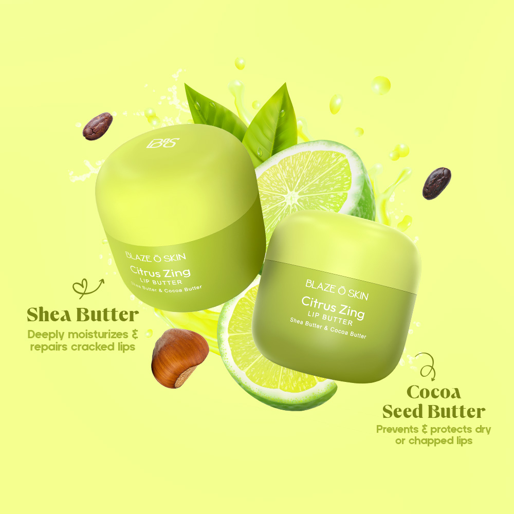 | Blaze O’ Skin Citrus Zing Lip Butter delivers deep moisturization while protecting your lips. This non-sticky, lightweight formula, enriched with Shea Butter and Cocoa Seed Butter, gently soothes dry, chapped lips and refreshes your senses with a tangy citrus flavor. |