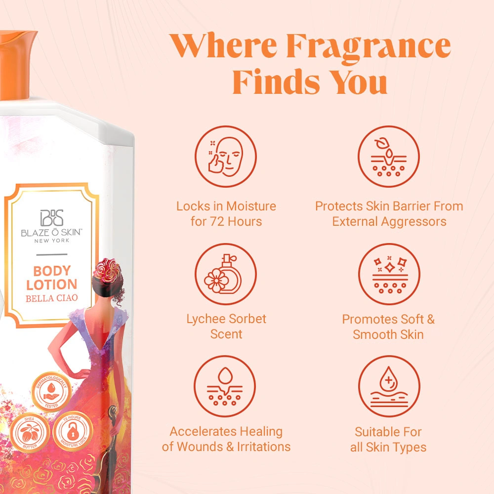 Indulge in the heavenly embrace of Blaze O’ Skin’s “Bella Ciao” Body Lotion! Let the tantalizing essence of lychee intertwine with a fountain of moisture, creating a symphony for your skin that lasts an incredible 72 hours. It bonds gracefully to safeguard the integrity of the skin barrier and speed up the process of healing superficial wounds and irritations.