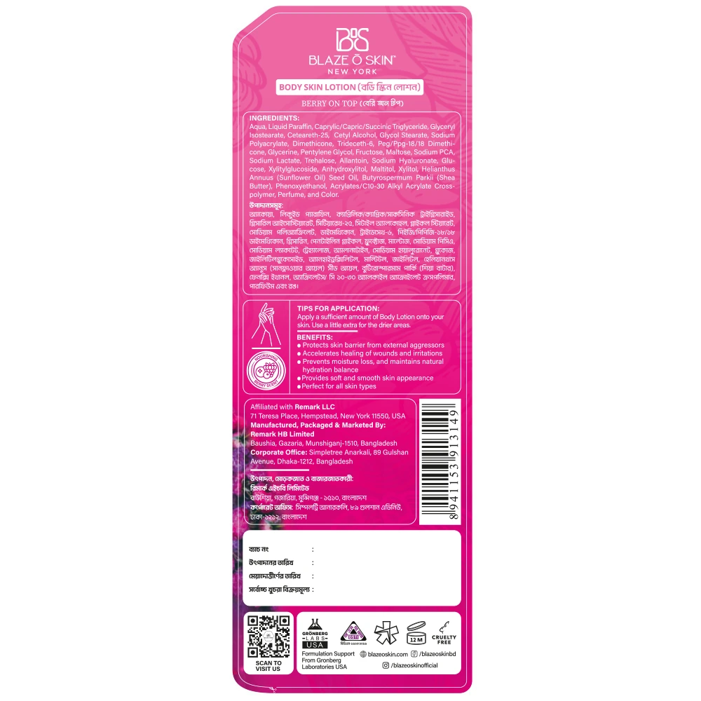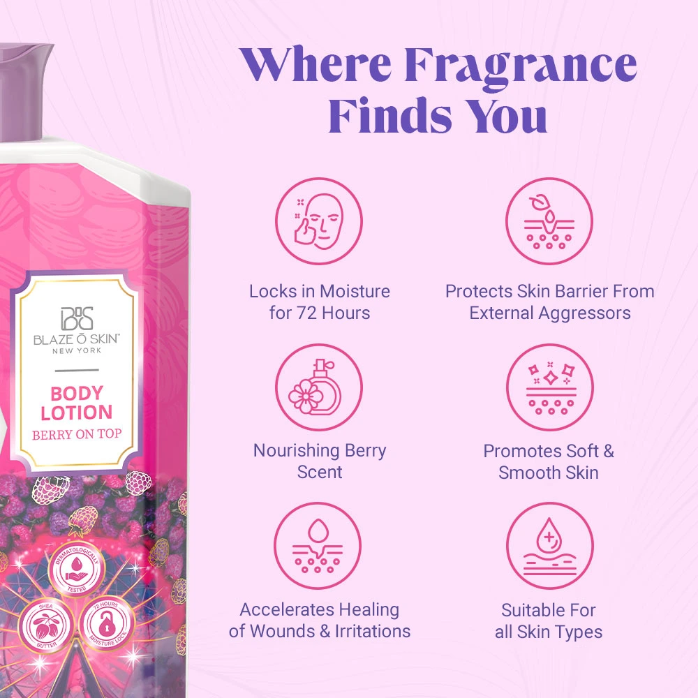 Indulge in the heavenly embrace of Blaze O’ Skin’s “Berry on Top” Body Lotion! Let the lingering berry scent intertwine with a fountain of moisture, creating a symphony for your skin that lasts an incredible 72 hours. It bonds gracefully to safeguard the integrity of the skin barrier and speed up the process of healing superficial wounds and irritations.