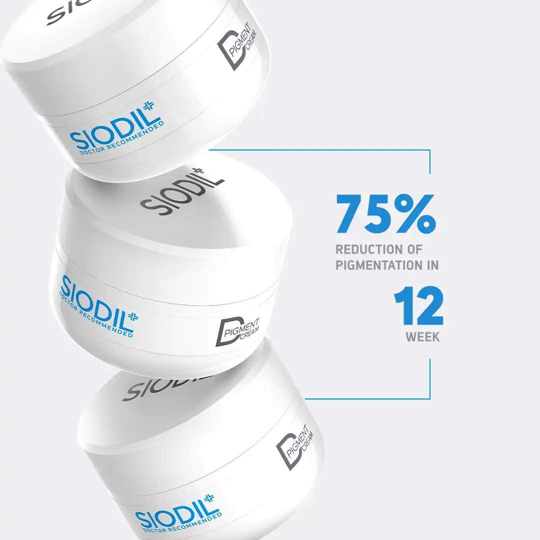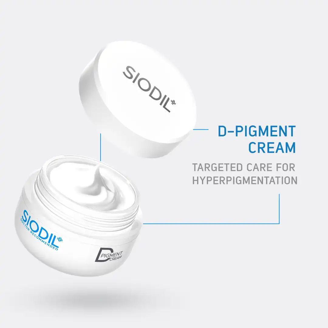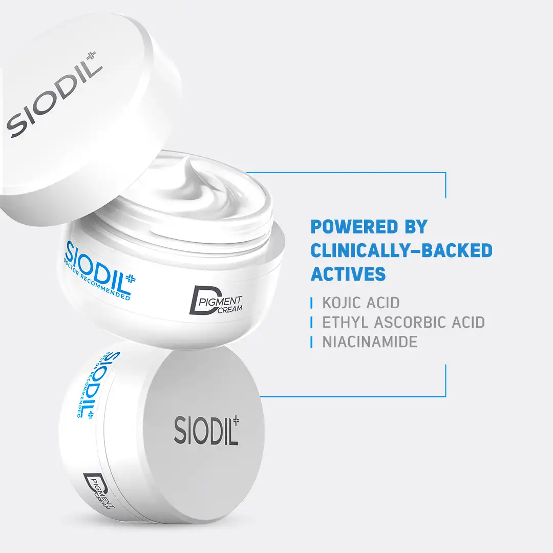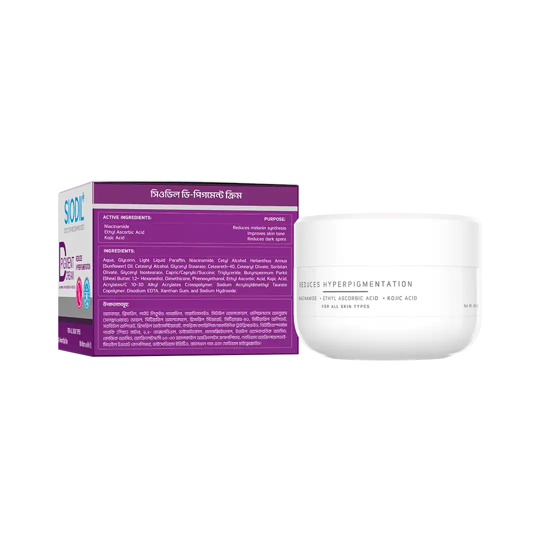 Siodil D-Pigment Cream, formulated with active ingredients like Niacinamide, Ethyl Ascorbic Acid and Kojic Acid helps to reduce the appearance of dark patches and spots, hyperpigmentation, and uneven skin tone, subsequently improving the overall skin tone and texture.