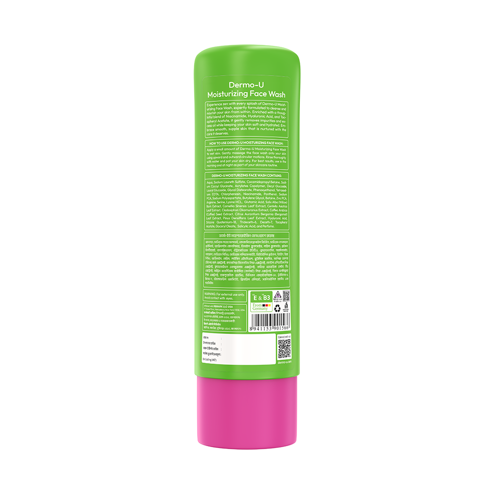 Experience zen with every splash of Dermo-U Moisturizing Face Wash, expertly formulated to cleanse and nourish your skin from within. Enriched with a thoughtful blend of Niacinamide, Hyaluronic Acid, and Tocopheryl Acetate, it gently removes impurities and excess oil while keeping your skin soft and hydrated. Embrace smooth, supple skin that is nurtured with the care it deserves.