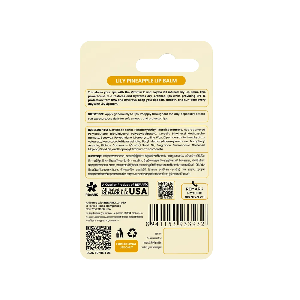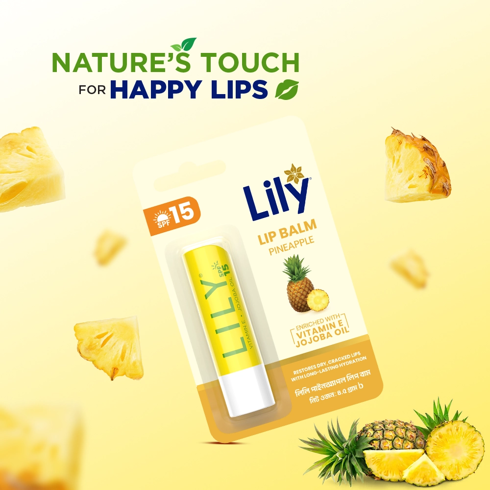 Transform your lips with Vitamin E and Jojoba Oil infused Lily Lip Balm. This powerhouse duo restores and hydrates dry, cracked lips while providing SPF 15 protection from UVA and UVB rays. Keep your lips soft, smooth, and sun-safe every day with Lily Lip Balm.