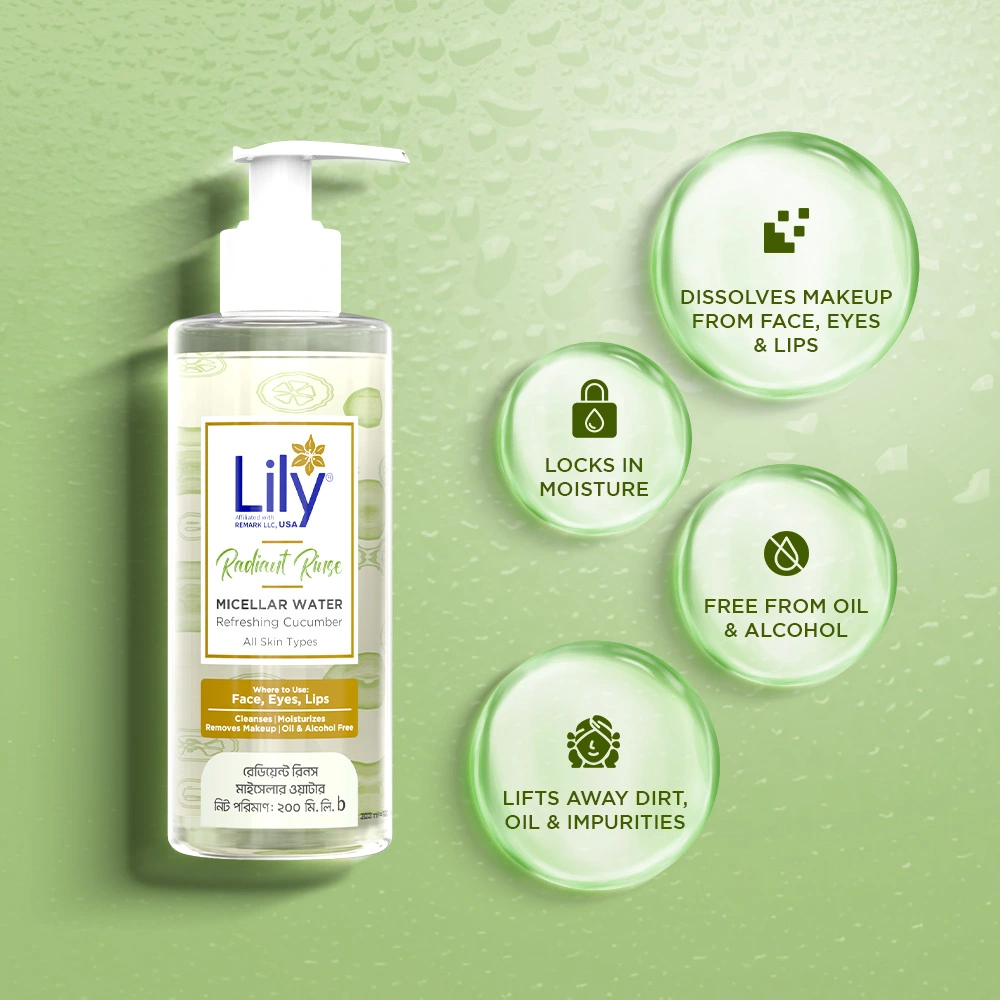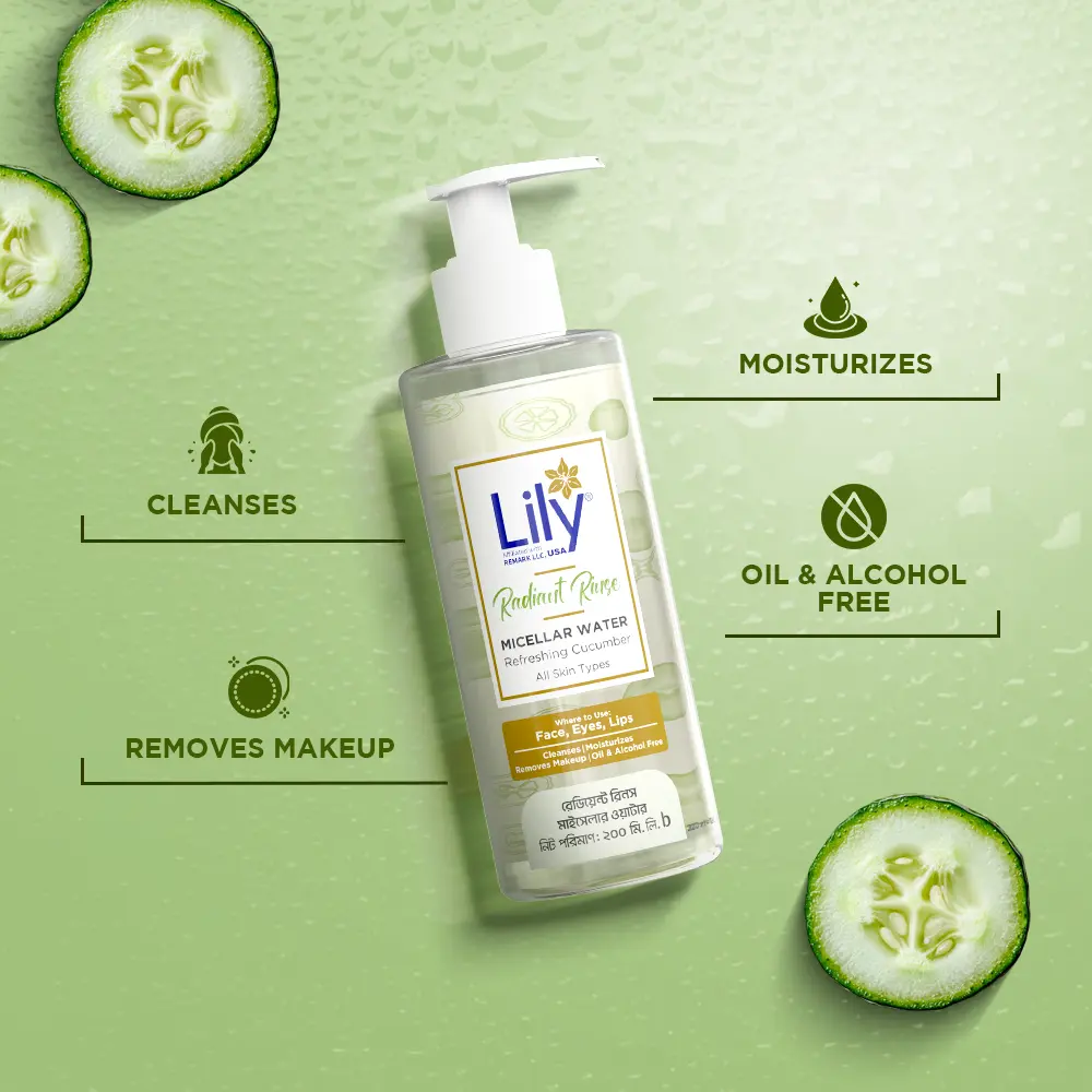 Lily Radiant Rinse Micellar Water Refreshing Cucumber delicately cleanses, effortlessly removes makeup, impurities, and pollution, while moisturizing and revitalizing sensitive skin, including the face, eyes, and lips, without leaving any residue behind.