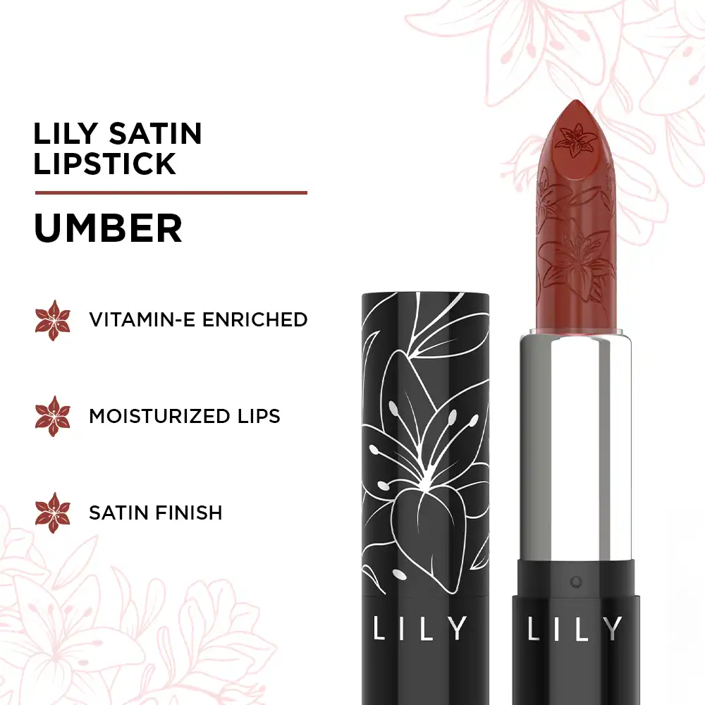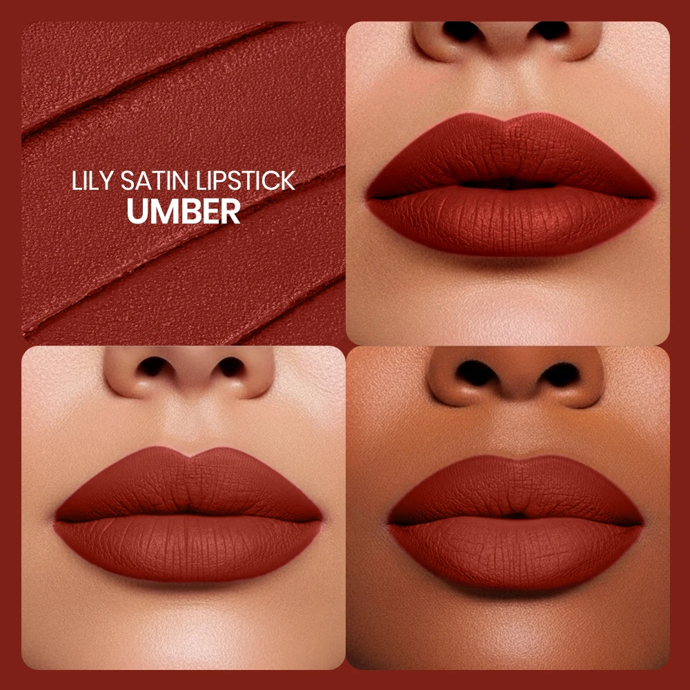Lily Satin Lipstick empowers your pout with vibrant color, long-lasting wear, and nourishing moisture. This lipstick features a buildable, smudge-proof formula for a natural finish that elevates your confidence. Feel assured and let your lips exude grace with a burst of nurturing moisture that lasts all day!