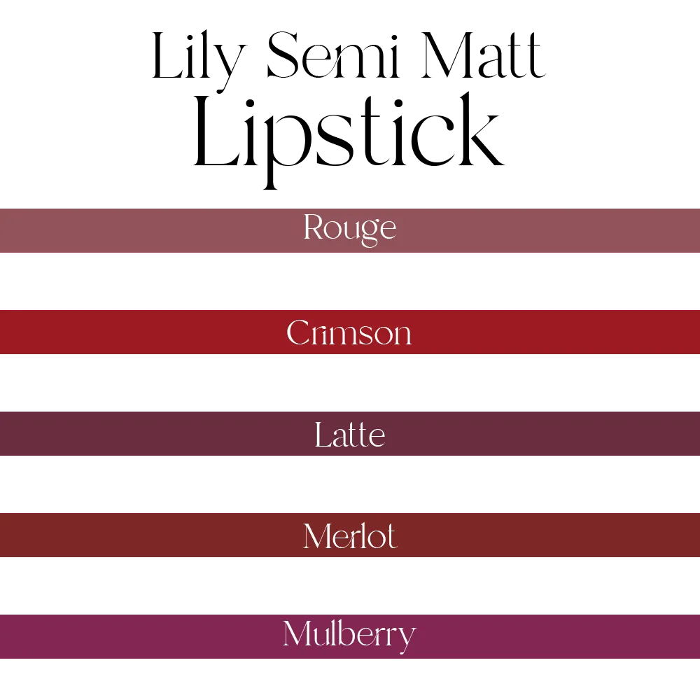 Vitamin E: In addition to adorning your lips with distinctive shades, Lily Semi Matt Lipstick nurtures and hydrates your lips, ensuring they maintain their graceful charm. Jojoba Oil: Guarantees your lips remain velvety smooth and poised from sunrise to sunset. Rosa Canina Oil: Gently soothes and heals chapped lips. Other Ingredients : Isododecane, Disteardimonium Hectorite, Octyldodecanol, Nylon-12, Silica, Hydrogenated Styrene/Butadiene Copolymer, Polymethylsilsesquioxane, Hydrogenated Polyisobutene, Diethylhexyl Syringyliden, Tocopheryl Acetate, Rosa Canina Oil, Jojoba Oil, Olea Europaea Oil, Butyrospermum Parkii Oil and FragranceDescription