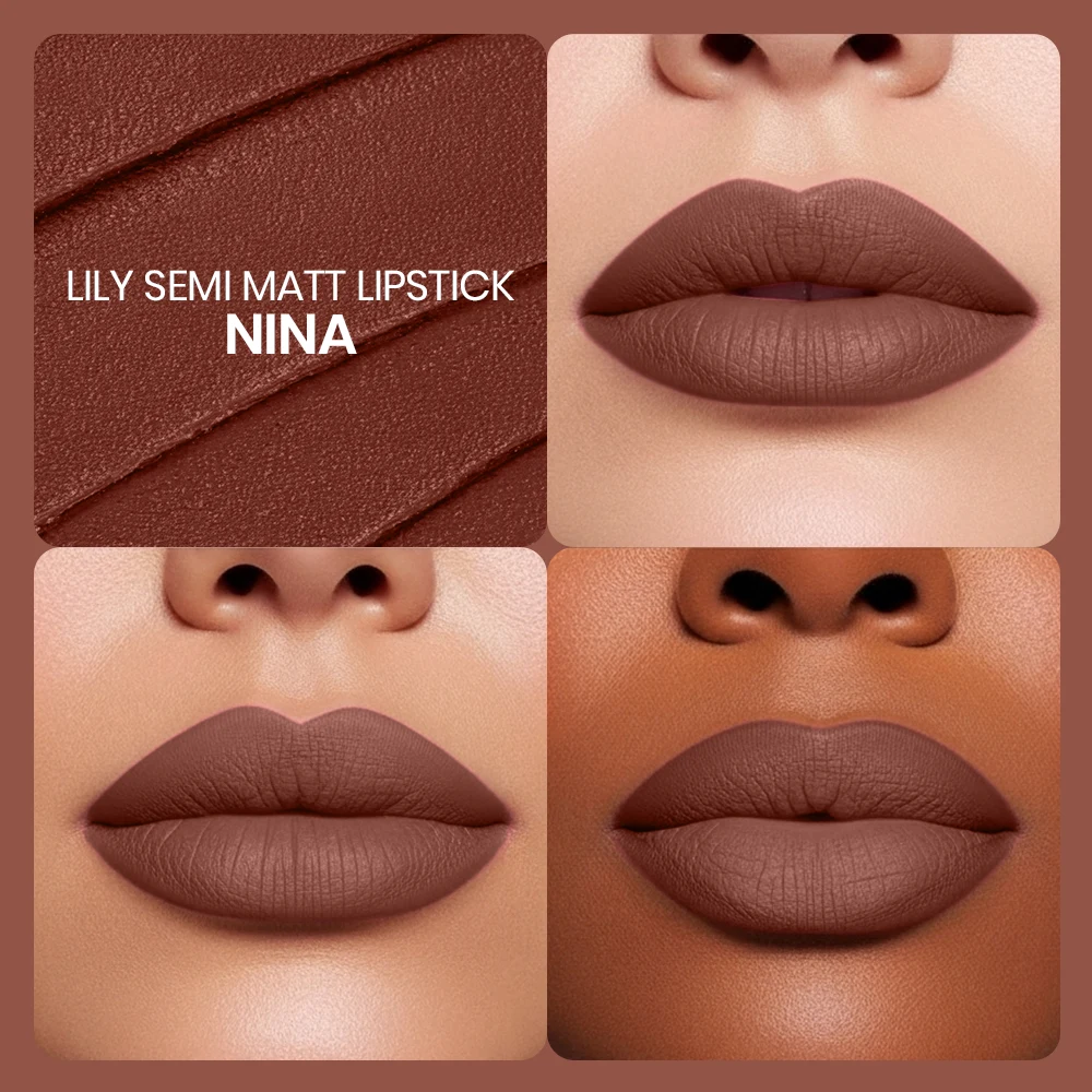 Vitamin E: In addition to adorning your lips with distinctive shades, Lily Semi Matt Lipstick nurtures and hydrates your lips, ensuring they maintain their graceful charm. Jojoba Oil: Guarantees your lips remain velvety smooth and poised from sunrise to sunset. Rosa Canina Oil: Gently soothes and heals chapped lips. Other Ingredients : Isododecane, Disteardimonium Hectorite, Octyldodecanol, Nylon-12, Silica, Hydrogenated Styrene/Butadiene Copolymer, Polymethylsilsesquioxane, Hydrogenated Polyisobutene, Diethylhexyl Syringyliden, Tocopheryl Acetate, Rosa Canina Oil, Jojoba Oil, Olea Europaea Oil, Butyrospermum Parkii Oil and FragranceDescription