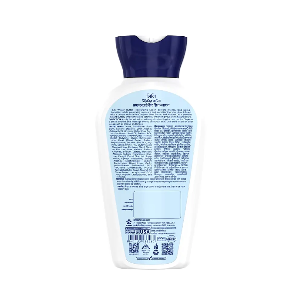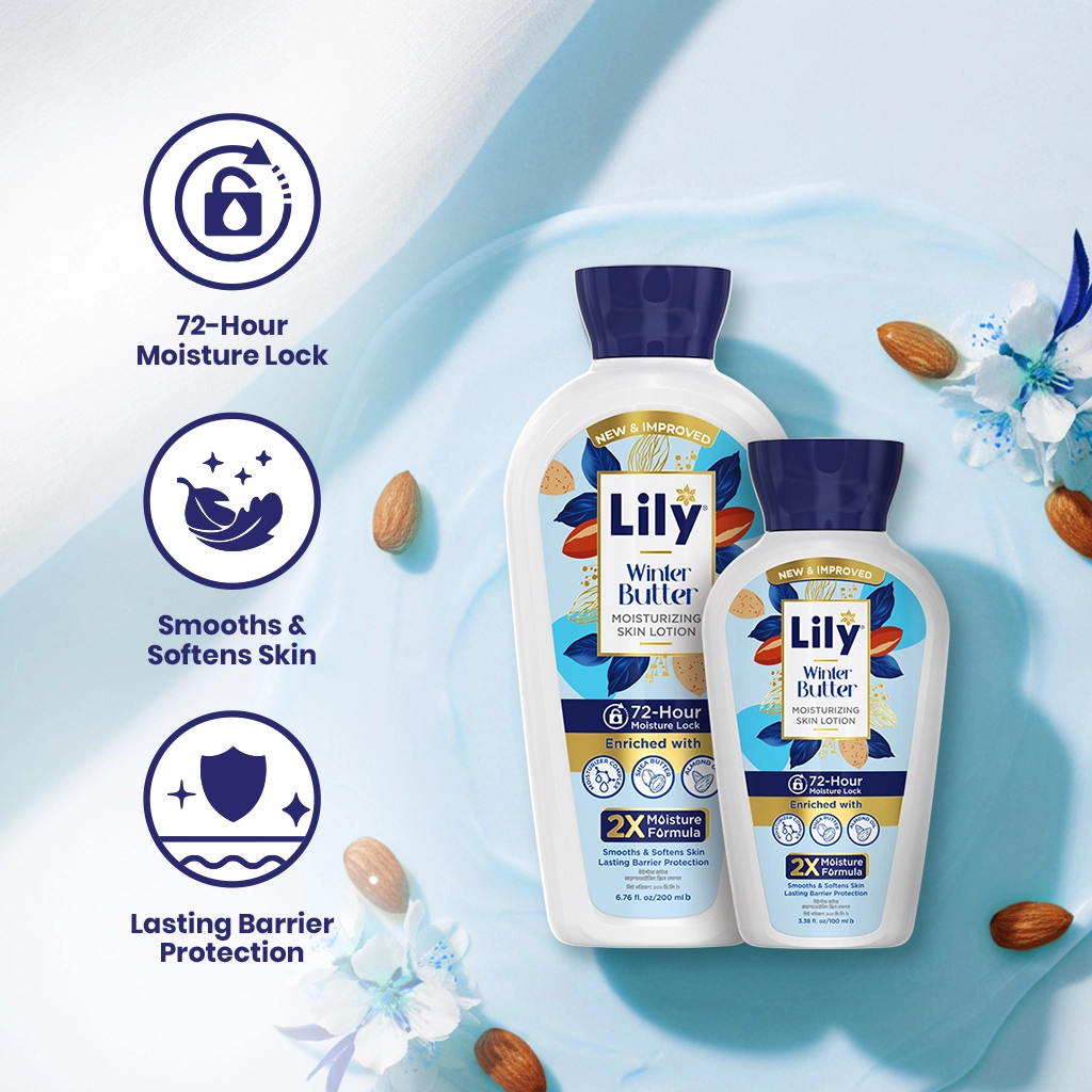 Lily Winter Butter Moisturizing Skin Lotion is designed to combat winter dryness with intense hydration and lasting protection. Powered by 2X Moisture Formula, Shea Butter, and Almond Oil, it deeply nourishes, smooths rough patches, and strengthens the skin’s barrier for silky-soft comfort that lasts up to 72 hours.