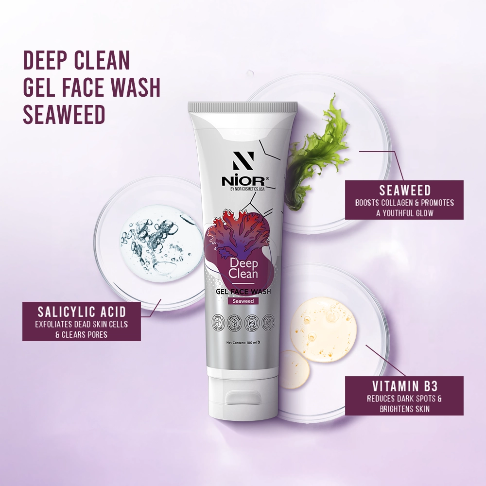 | Unlock vibrant, youthful skin with NIOR’s Seaweed-infused Deep Clean Gel Face Wash. This potent formula, enriched with Seaweed, Vitamin C, and Vitamin E, boosts collagen, reduces fine lines, and enhances skin plumpness. Reveal a more radiant, youthful glow with every use. |