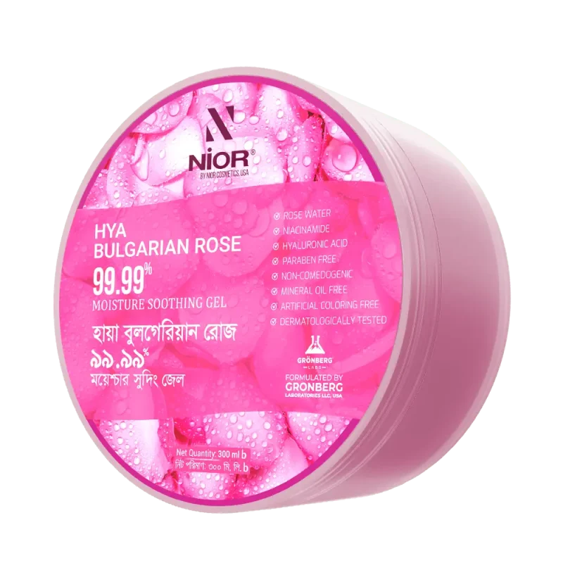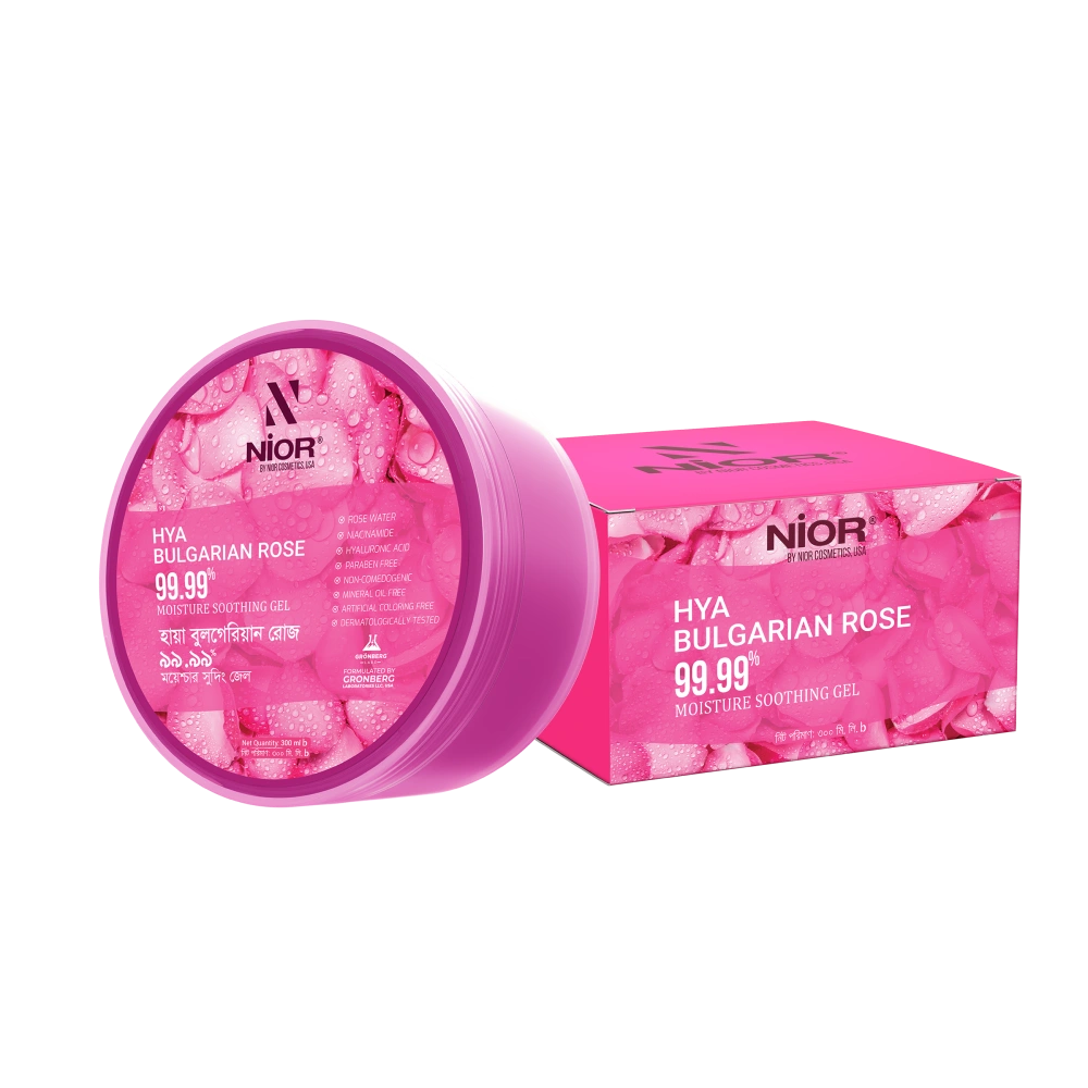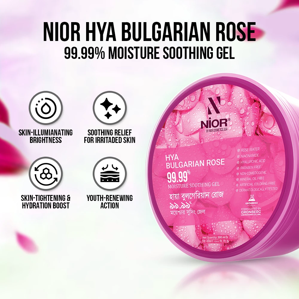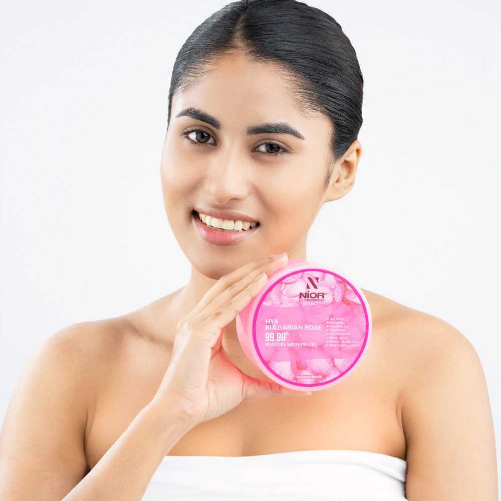 NIOR Hya Bulgarian Rose 99.99% MOISTURE SOOTHING GEL contains 99.99% Rose Water extract to make skin soft and moisturized & it also has hyaluronic acid which helps to keep our skin hydrated all day long. It smoothens skin texture and reduces the risk of skin damage caused by UV rays by strengthening the skin barrier.