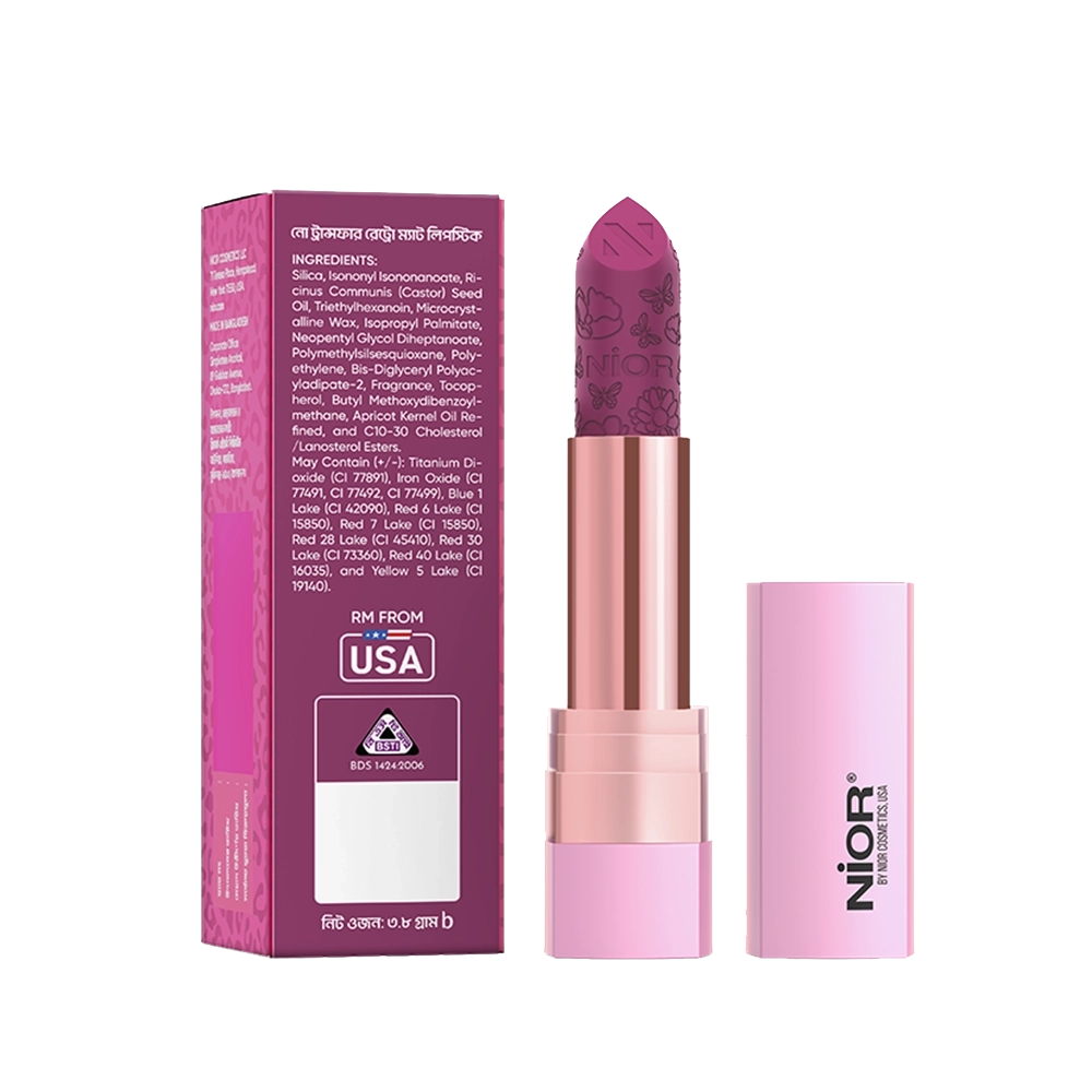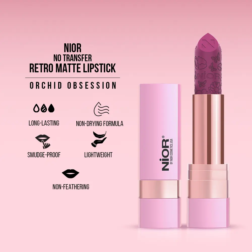 NIOR No Transfer Retro Matte Lipstick offers a rich, bold color in a single swipe with a flawless, transfer-proof matte finish. This lightweight, non-drying formula ensures long-lasting wear without feathering or smudging, making it a perfect choice for all-day wear. Available in a curated range of classic shades, it’s designed for those who love a timeless matte look without compromise.