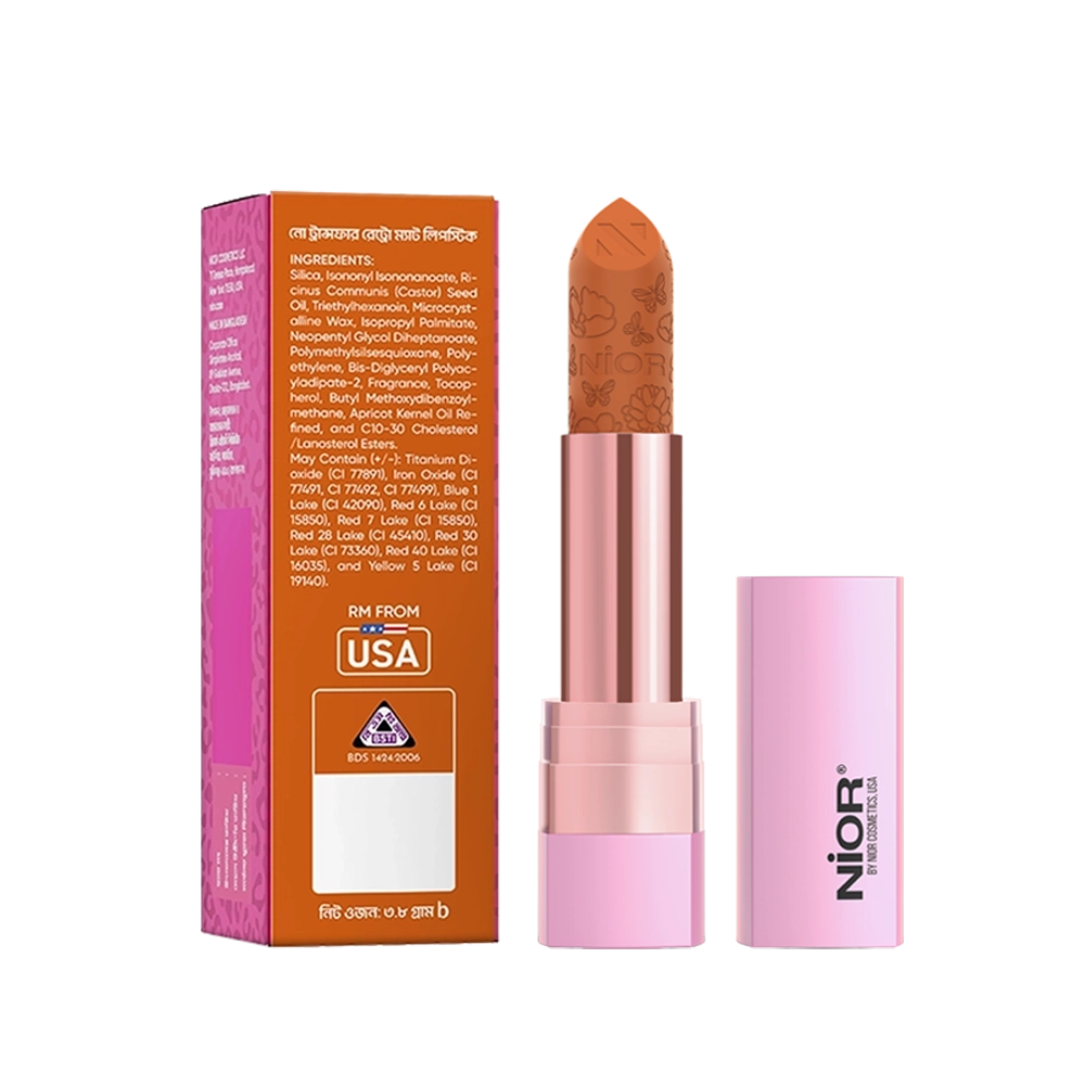 NIOR No Transfer Retro Matte Lipstick offers a rich, bold color in a single swipe with a flawless, transfer-proof matte finish. This lightweight, non-drying formula ensures long-lasting wear without feathering or smudging, making it a perfect choice for all-day wear. Available in a curated range of classic shades, it’s designed for those who love a timeless matte look without compromise.