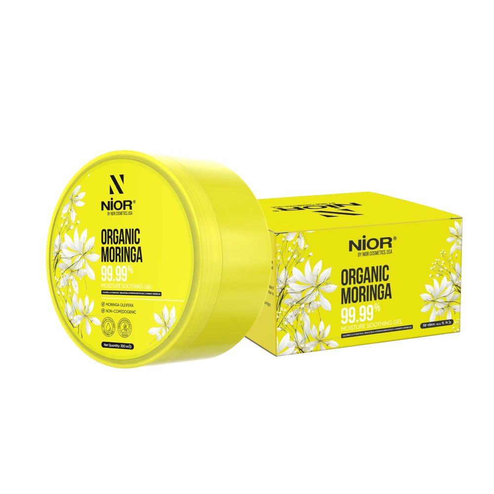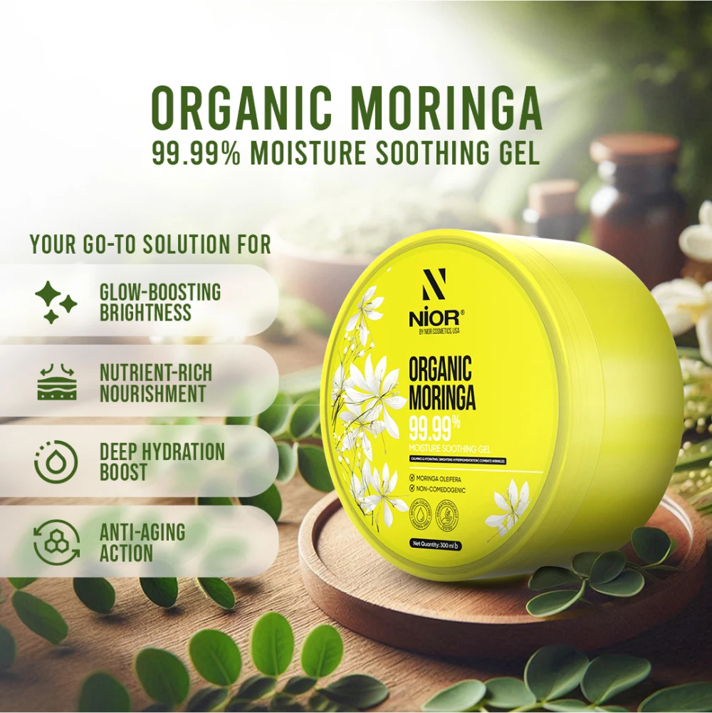NIOR Organic Moringa 99.99% Moisture Soothing Gel envelops you in serenity with its infusion of Moringa Oleifera, providing calming hydration while brightening hyperpigmentation and combating wrinkles. Experience its anti-aging prowess and enjoy a rejuvenated, exquisitely refreshed complexion.