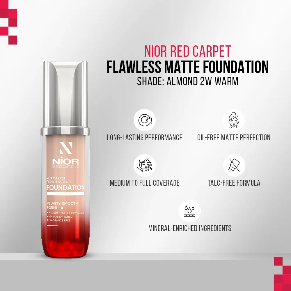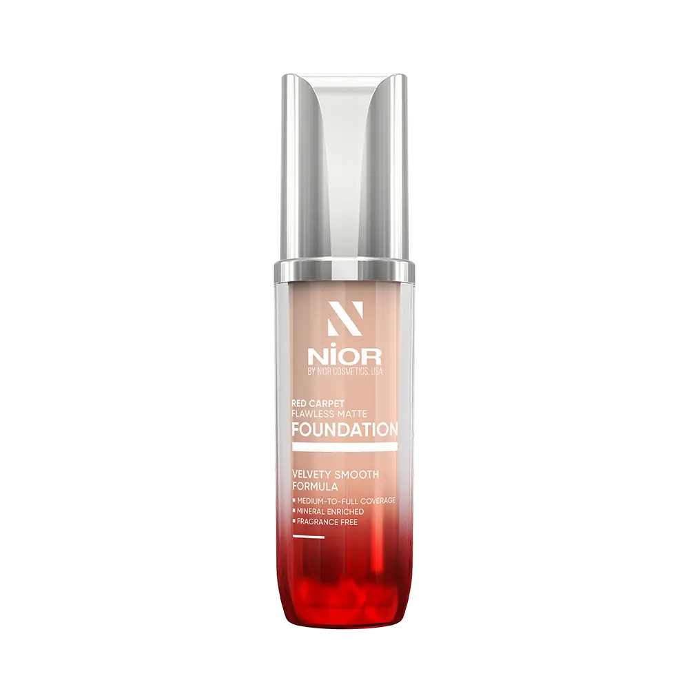 | Channel red carpet elegance with Nior Red Carpet Flawless Matte Foundation. This miracle formula provides flawless medium to full coverage with a nourishing mineral-enriched blend, crafted without talc, parabens, or fragrance. Stay picture-perfect all day with its waterproof and transfer-resistant formula, and step into the limelight, shining like a star. |
