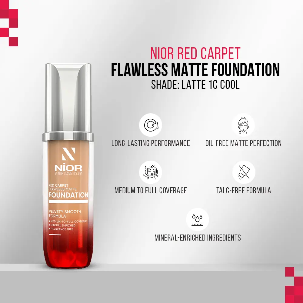 | Channel red carpet elegance with Nior Red Carpet Flawless Matte Foundation. This miracle formula provides flawless medium to full coverage with a nourishing mineral-enriched blend, crafted without talc, parabens, or fragrance. Stay picture-perfect all day with its waterproof and transfer-resistant formula, and step into the limelight, shining like a star. |