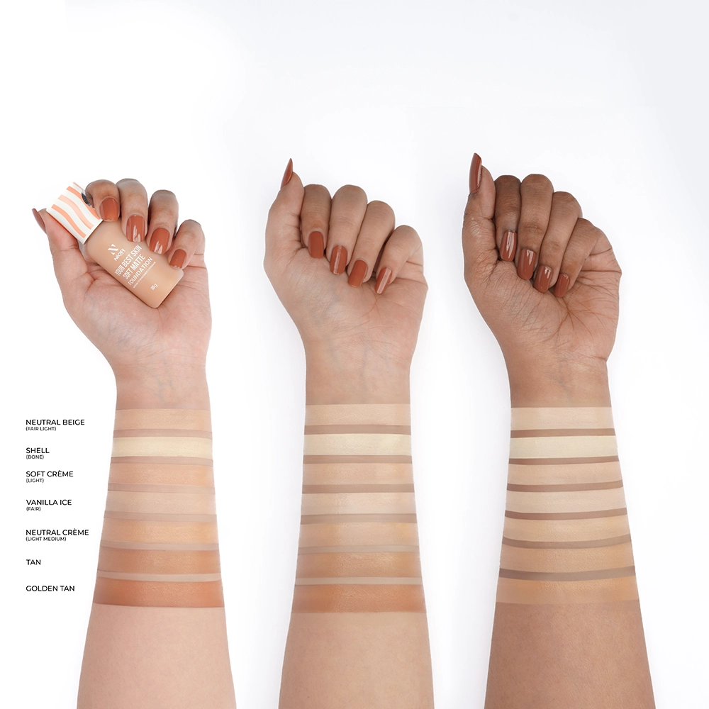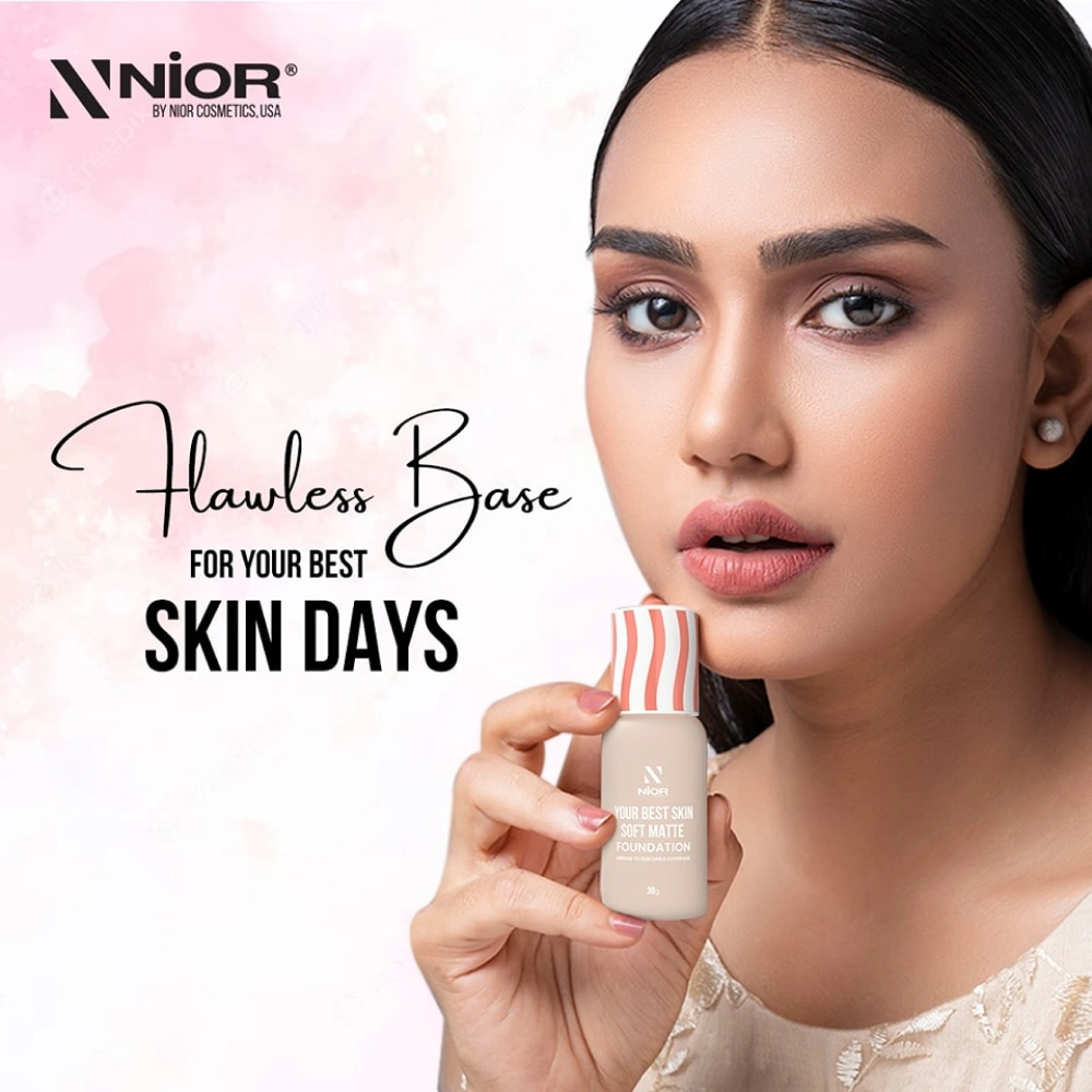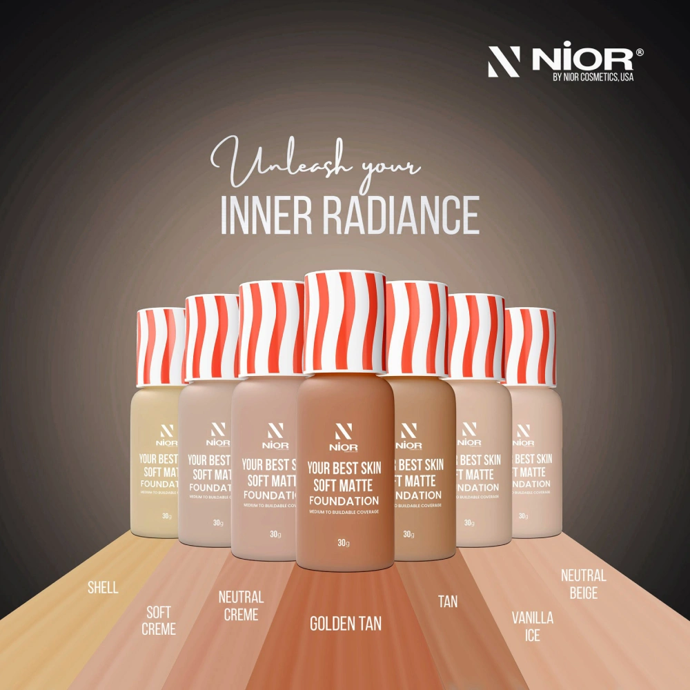 The most important thing to do before applying foundation is to find the right shade for your skin. The proper foundation shade can make all the difference. Apply different shades of the “NIOR Your Best Skin Soft Matte Foundation” to your jawline to see which looks best on your complexion. If the shade disappears without blending after application, you’ve found your perfect match.