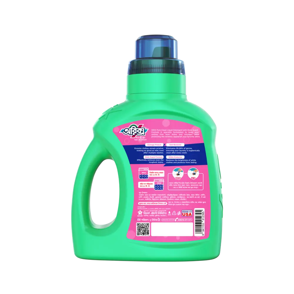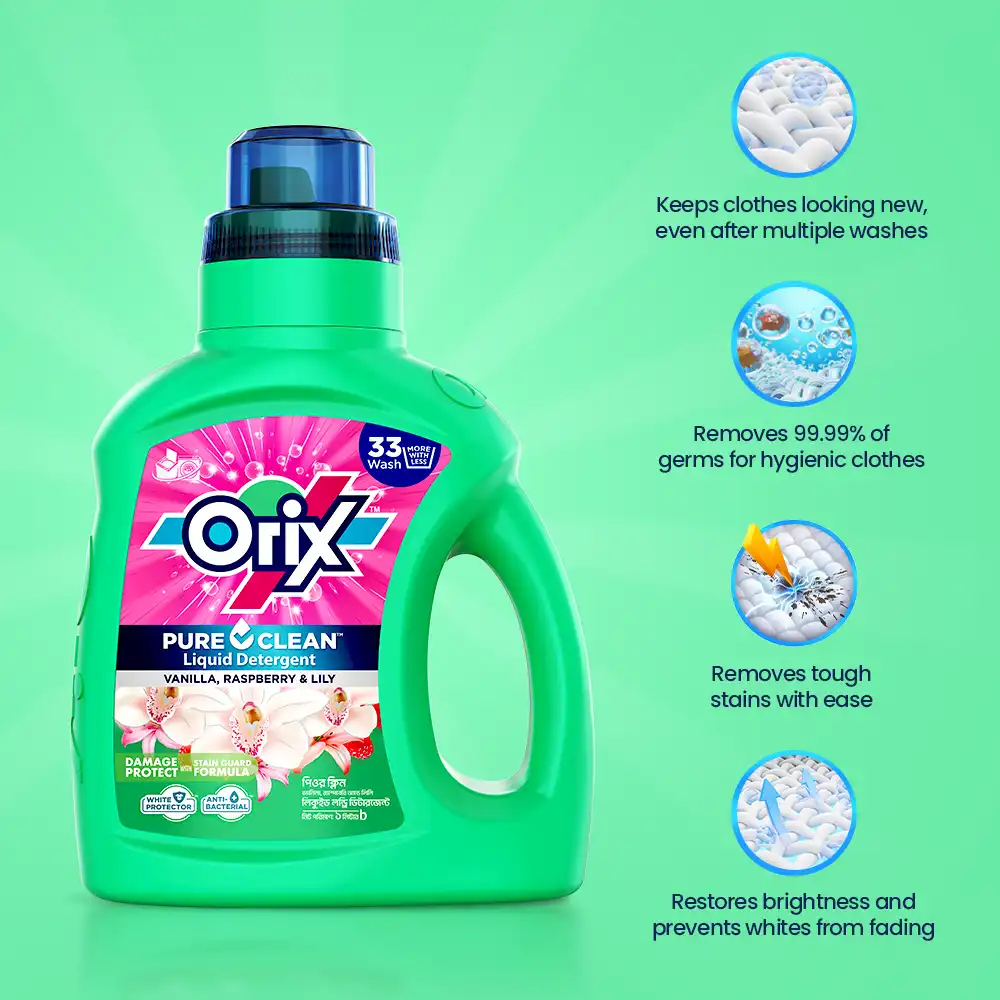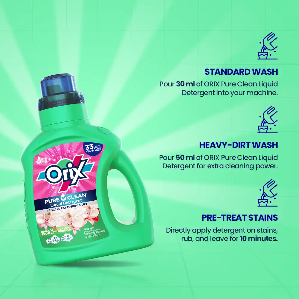 2. Anti-Bacterial- Removes 99.99% of germs to ensure your laundry is hygienically clean after every wash. 3. Stain Guard Formula- Gently removes the toughest of stains 4. White Protector- Restores the brightness of white clothes and protects from fading. 2. Use an additional 30 ml of ORIX Pure Clean Liquid Detergent for large loads or heavily dirty clothes. 3. Apply a little ORIX Pure Clean Liquid Detergent directly on the tough stains, rub gently with the scrubber cap, and wait for 10 minutes. 2. Keep away from children and avoid oral intake. 3. Keep Orix Pure Clean Liquid Detergent in its original container and close the lid tightly when not in use.Description