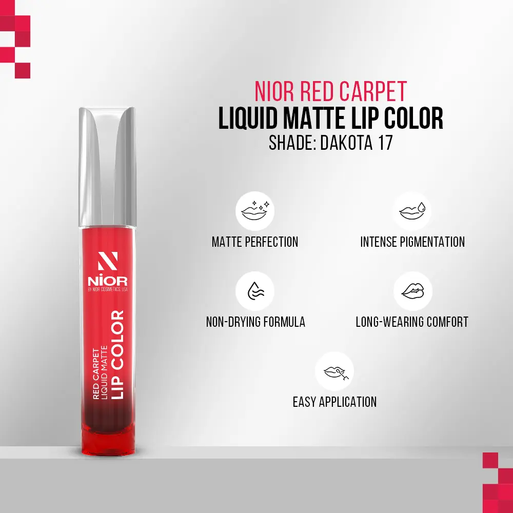 | NIOR Red Carpet Liquid Matte Lip Color redefines your lip look with unparalleled style and durability. Featuring a sophisticated matte finish, this formula delivers intense, saturated color while nourishing your lips with shea butter and oils, ensuring a confident, long-lasting appearance from dawn till dusk. |