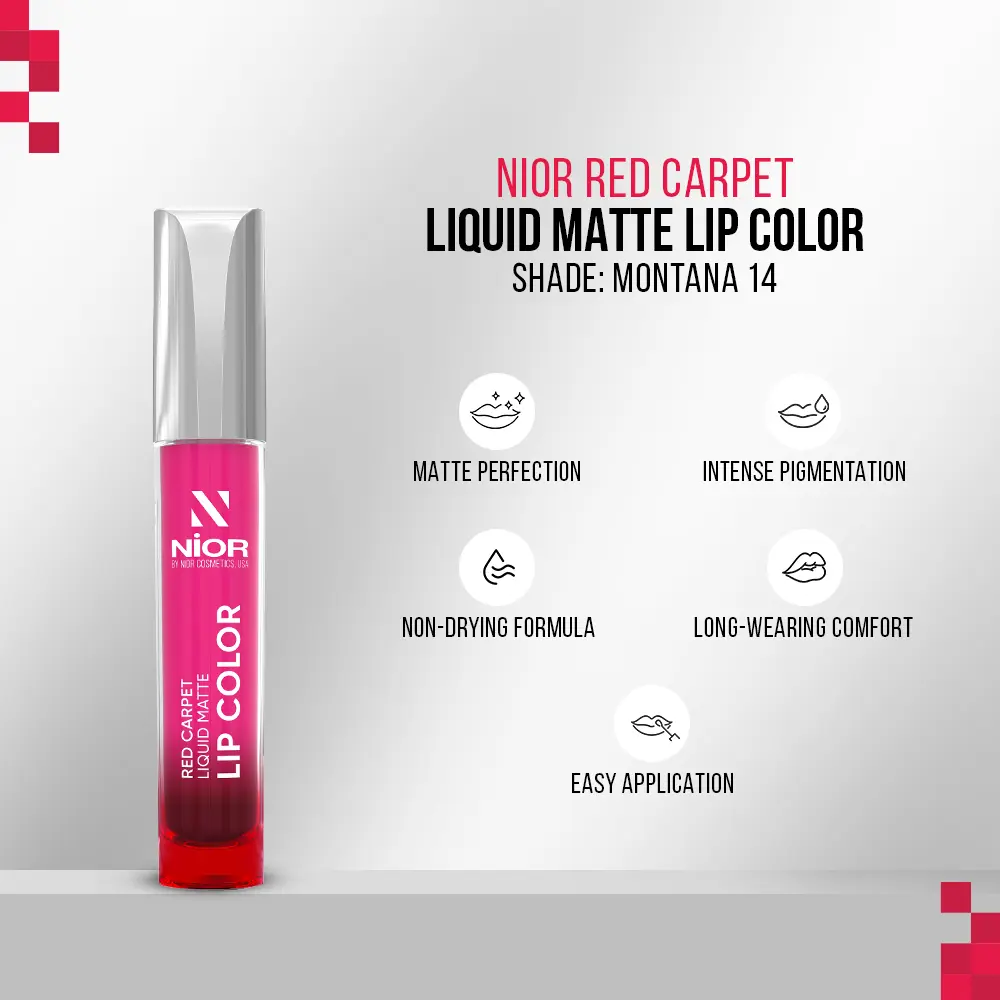| NIOR Red Carpet Liquid Matte Lip Color redefines your lip look with unparalleled style and durability. Featuring a sophisticated matte finish, this formula delivers intense, saturated color while nourishing your lips with shea butter and oils, ensuring a confident, long-lasting appearance from dawn till dusk. |