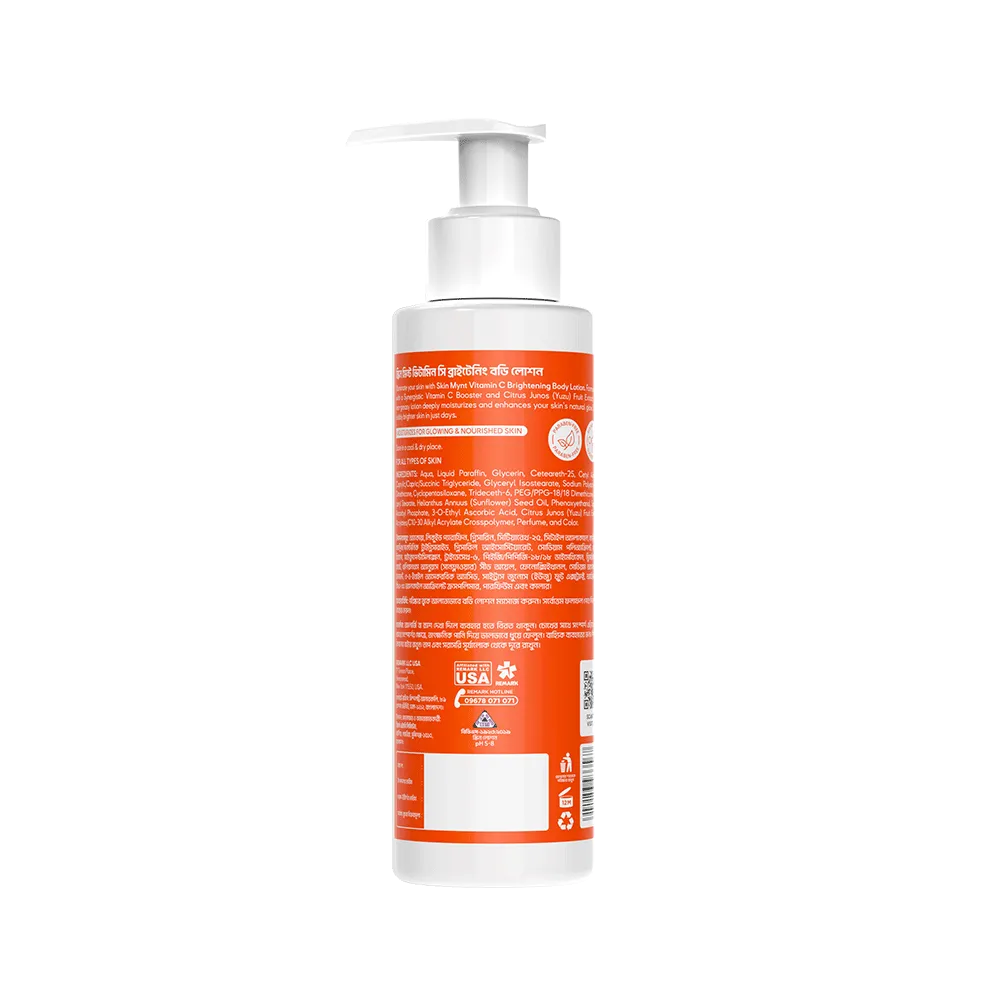 Illuminate your skin with Skin Mynt Vitamin C Brightening Body Lotion. Formulated with a Synergistic Vitamin C Booster and Citrus Junos (Yuzu) Fruit Extract, this non-greasy lotion deeply moisturizes and enhances your skin’s natural glow. Enjoy visibly brighter skin in just days.