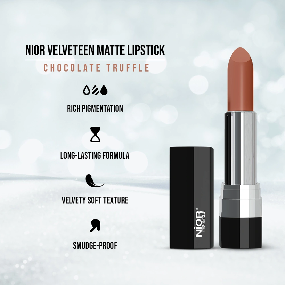 NIOR Velveteen Matte Lipstick seals your pout with a sumptuous touch of velvety perfection. Crafted for sophistication, our long-lasting formula delivers a seamless finish, rich in pigmentation, and flawlessly smudge-proof.